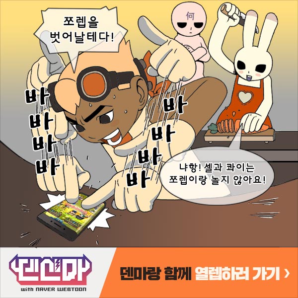 In original version, at April 2, 2019, Denma, Quai, she appeared with an advertisement of Densinma with NAVER WEBTOON. Denma plays a game, and it sounds 'Bang Bang Bang' like Passionate Banging. Denma said, "I'll escape low level!", and Quai's forehead, 何 (what) is written and she said "Nyah-Hang! Cell and Quai don't play with the low level!"
